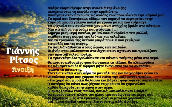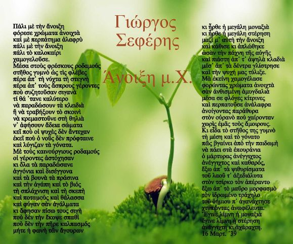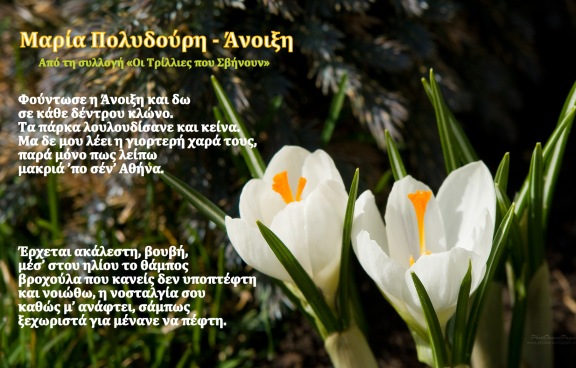 Η ποίηση, και αυτή πιστή στην αποστολή της, εμπνεύσθηκε από την άνοιξη και την ύμνησε πότε με αισιοδοξία και πότε μελαγχολικά, δωρίζοντάς μας καρπούς οίστρου που πάλλουν το είναι μας και αποτυπώνουν συγκινήσεις, αξίες και μηνύματα, που οι ποιητές, ως θεματοφύλακες, διαφυλάσσουν ως κόρην οφθαλμού για την πορεία του έρημου ανθρώπου σε αυτόν τον πλανήτη.